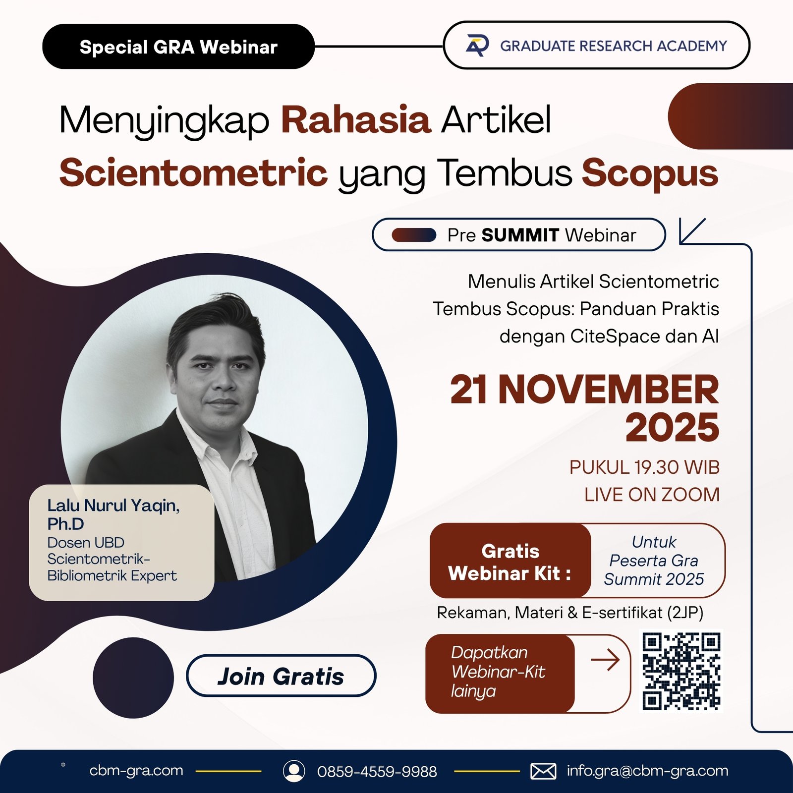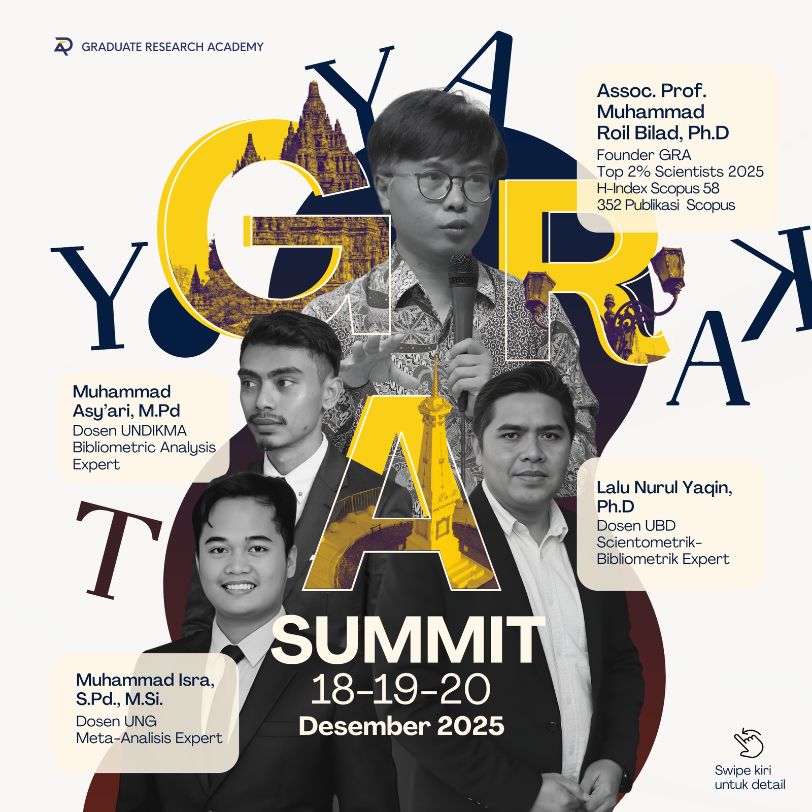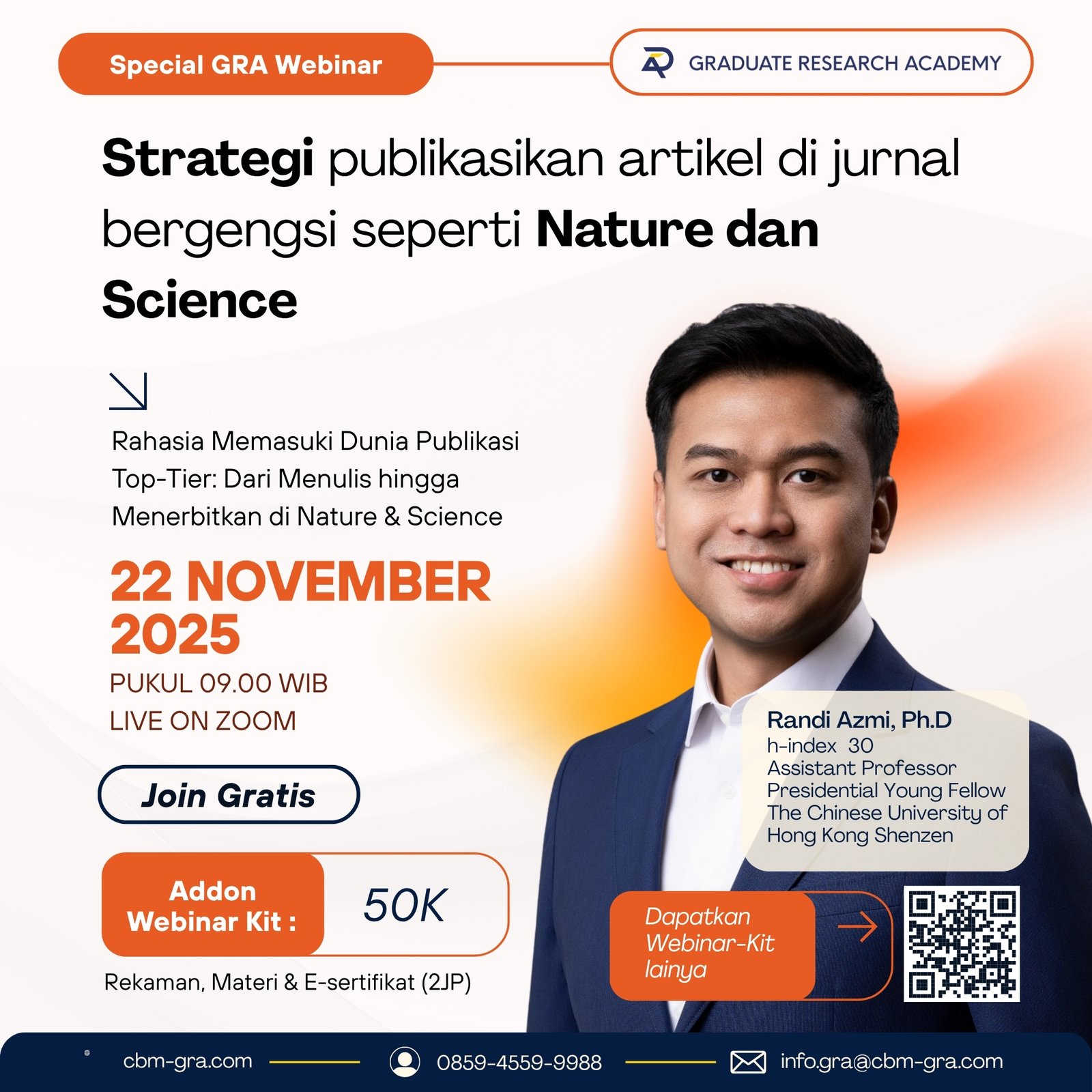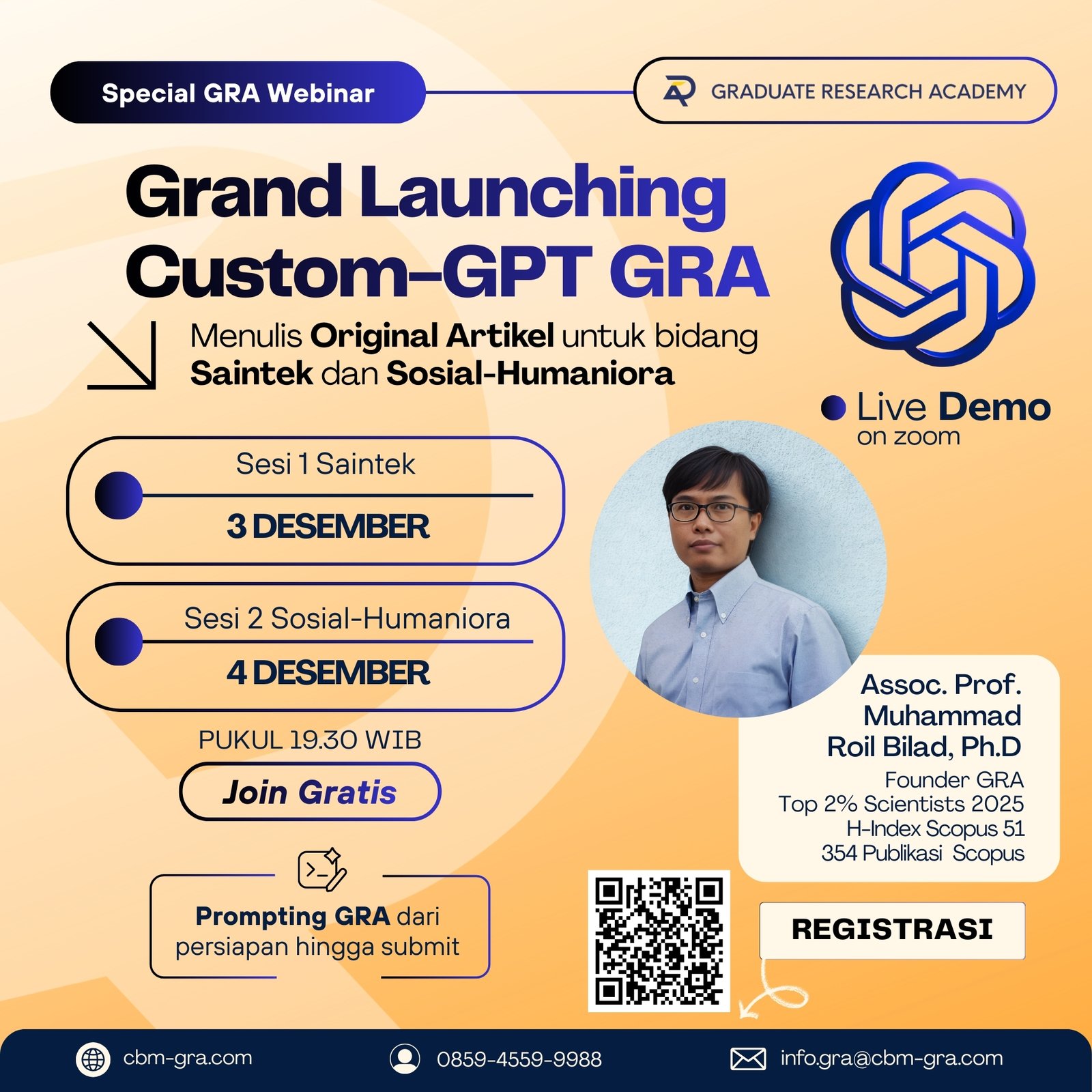 Graduate Research Academy mempersembahkan pertemuan para pakar terkemuka dalam dunia riset dan publikasi ilmiah pada tanggal 18-20 Desember 2025. Dapatkan Fasilitas senilai 5,2 Juta Rupiah, akun premium chat GPT, akses Scopus & Web of Science (lifetime), materi eksklusif, dan banyak lagi!