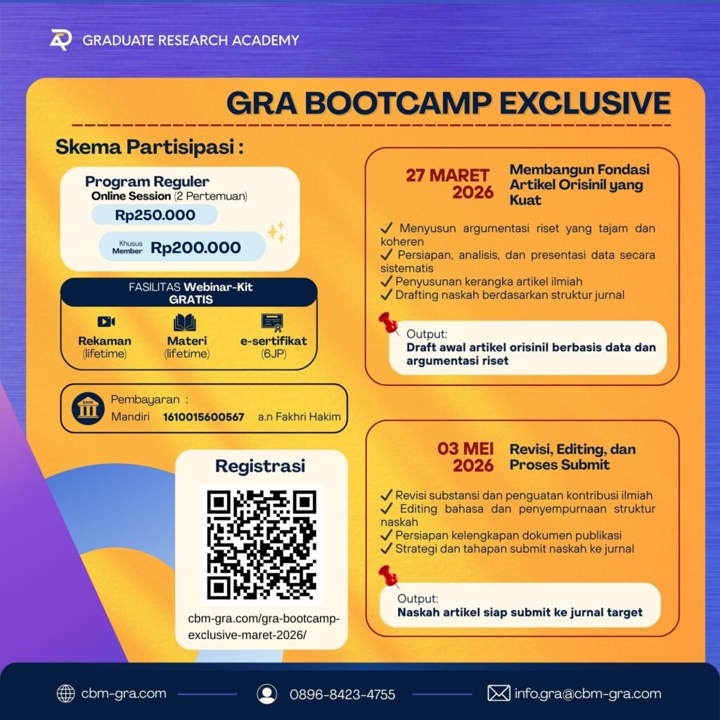 Saatnya upgrade kualitas manuskrip Anda melalui GRA Bootcamp Exclusive MARET 2026 — program terstruktur yang dirancang khusus untuk membantu dosen, peneliti, dan mahasiswa pascasarjana menghasilkan naskah artikel siap submit ke jurnal target