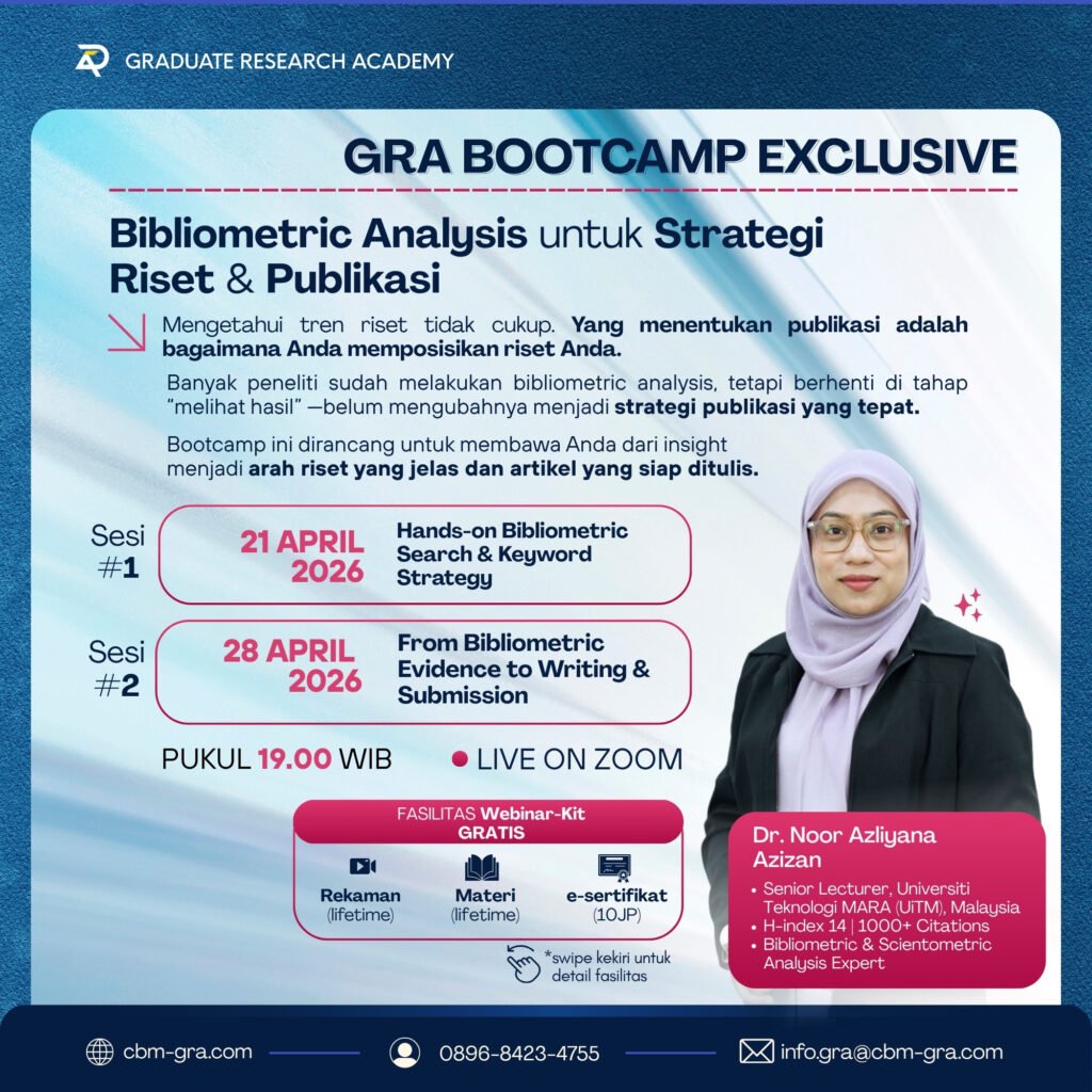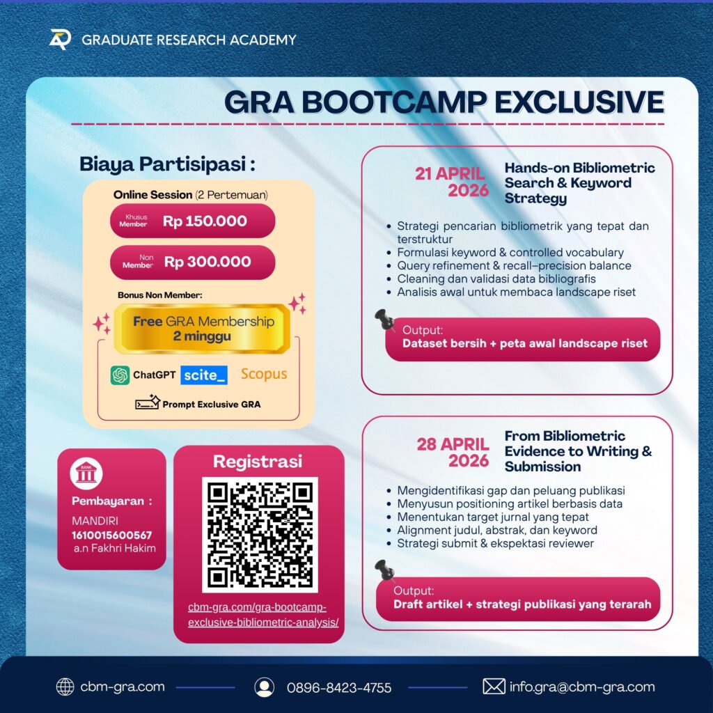 GRA Bootcamp Exclusive: Bibliometric Analysis untuk Strategi Riset & Publikasi Bukan sekadar memahami tren riset—pelajari cara mengubahnya menjadi strategi publikasi yang terarah dan artikel siap submit. Graduate Research Academy (GRA) menghadirkan program intensif: GRA Bootcamp Exclusive Bibliometric Analysis untuk Strategi Riset & Publikasi Mengetahui tren riset tidak cukup.Yang menentukan publikasi adalah bagaimana Anda membaca gap…