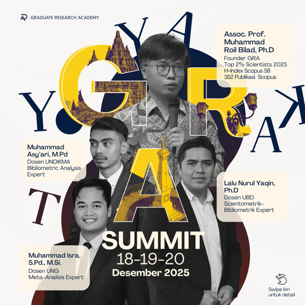 Graduate Research Academy mempersembahkan pertemuan para pakar terkemuka dalam dunia riset dan publikasi ilmiah pada tanggal 18-19-20 Desember 2025. Temui para ahli yang akan berbagi wawasan mendalam:🎤 Assoc. Prof. Muhammad Roil Bilad, Ph.D (Founder GRA, Top 2% Scientists 2025, H-Index Scopus 58)🎤 Muhammad Asy’ari, M.Pd (Dosen UNDIKMA, Bibliometric Analysis Expert)🎤 Lalu Nurul Yaqin, Ph.D (Dosen…