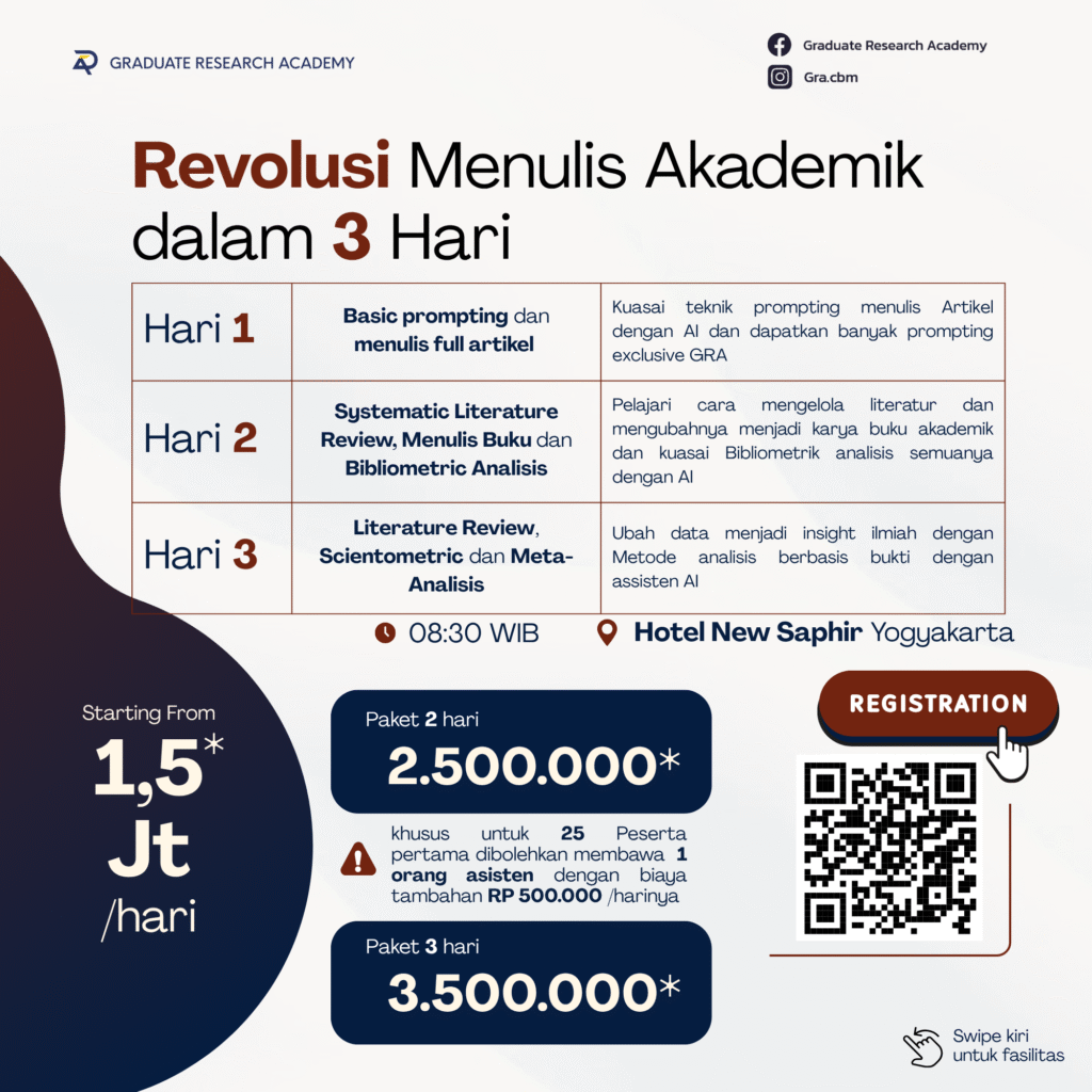 Graduate Research Academy mempersembahkan pertemuan para pakar terkemuka dalam dunia riset dan publikasi ilmiah pada tanggal 18-19-20 Desember 2025.