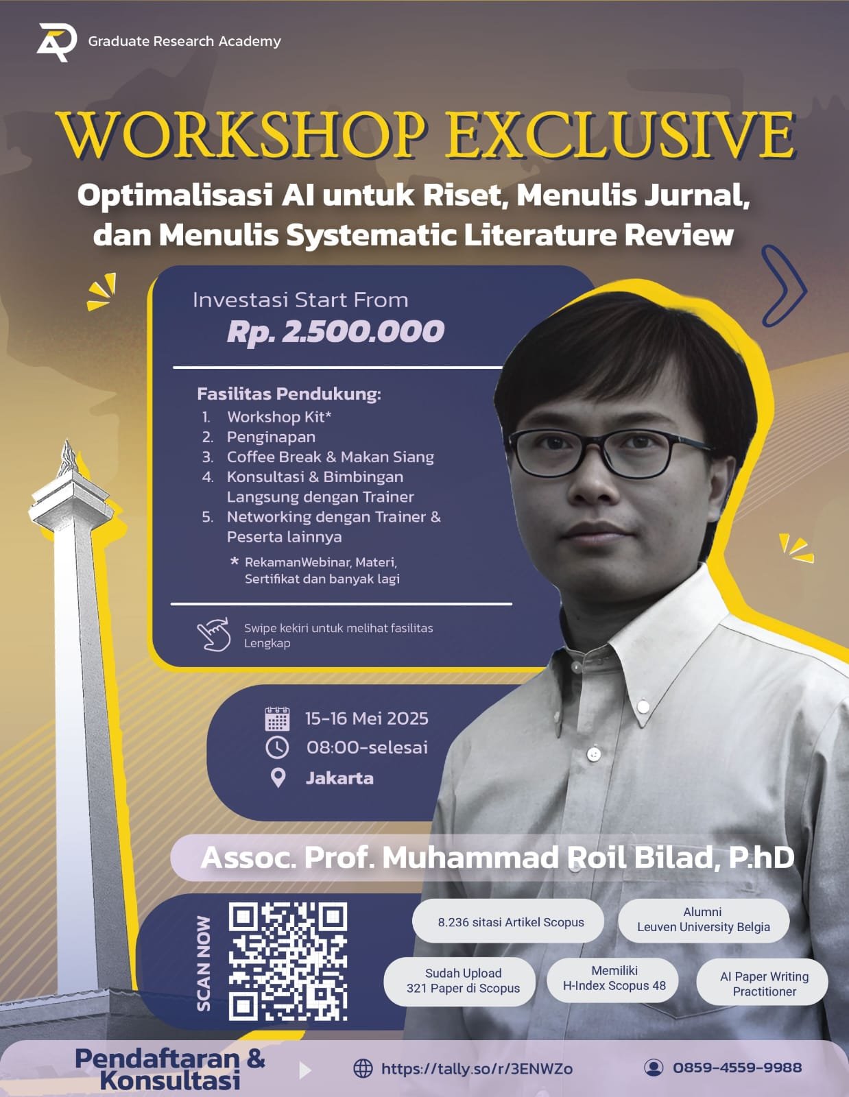 Jangan lewatkan pelatihan praktis mengenai AI untuk riset, menulis jurnal, dan systematic literature review. Dalam workshop ini, Anda akan belajar langsung dari Assoc. Prof. Muhammad Roil Bilad, Ph.D, seorang ahli dengan 8.236 sitasi artikel Scopus dan H-index Scopus 48.